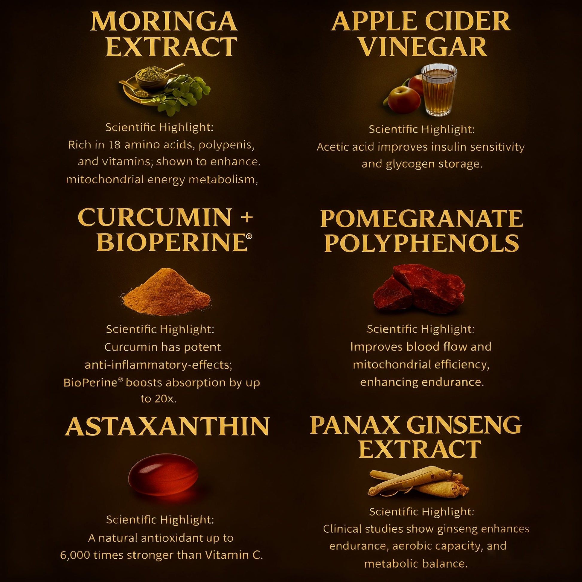 Pomegranate Polyphenols — Enhances blood flow and mitochondrial efficiency, boosts endurance